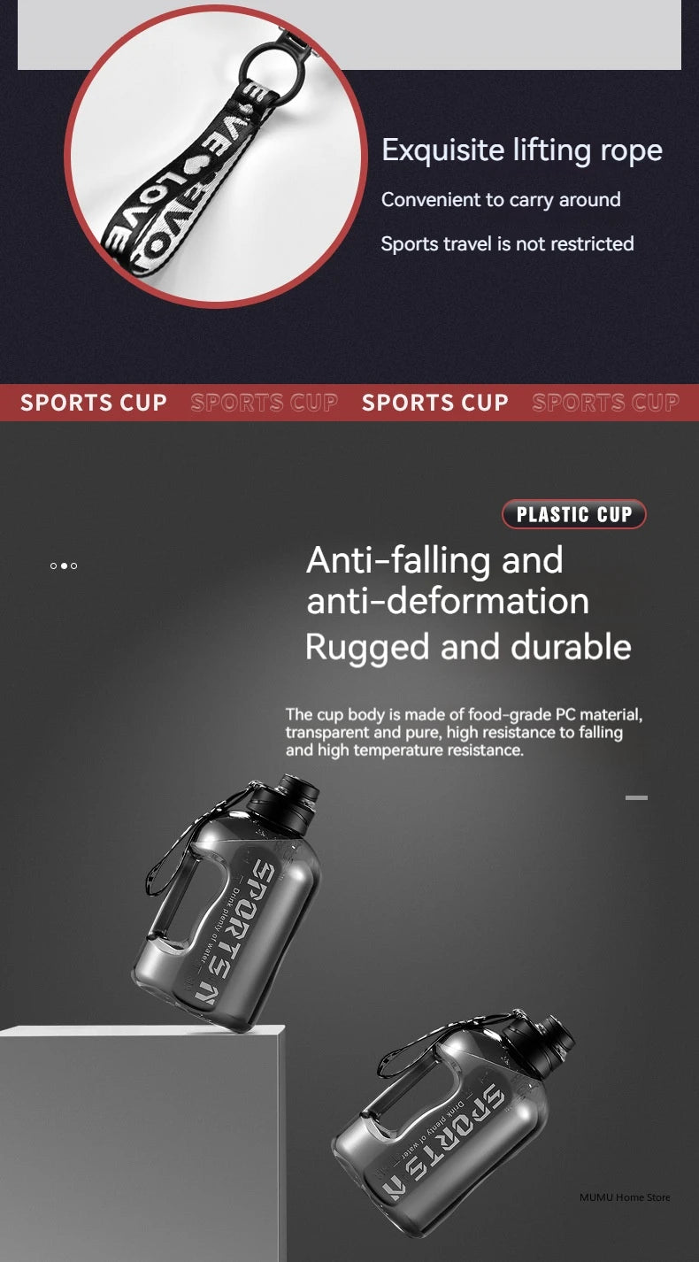 Restez parfaitement hydraté tout au long de la journée avec notre bouteille d'eau sport grande capacité de 2.7L. Conçue pour les sportifs et les personnes actives, cette gourde robuste et portable est votre partenaire idéal pour le fitness, la musculation, le cyclisme et toutes vos activités physiques.
